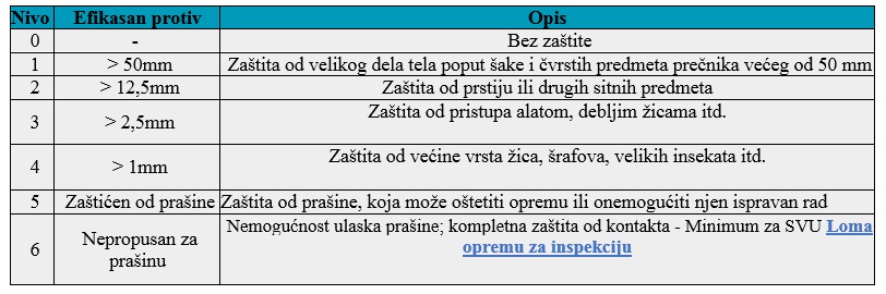 Tabela u nastavku prikazuje skalu zaštite od čvrstih predmeta: